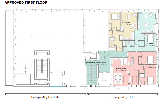 The first floor is fully occupied and split between two tenants, Nu Delhi Restaurant and an office suite occupied by CO3.