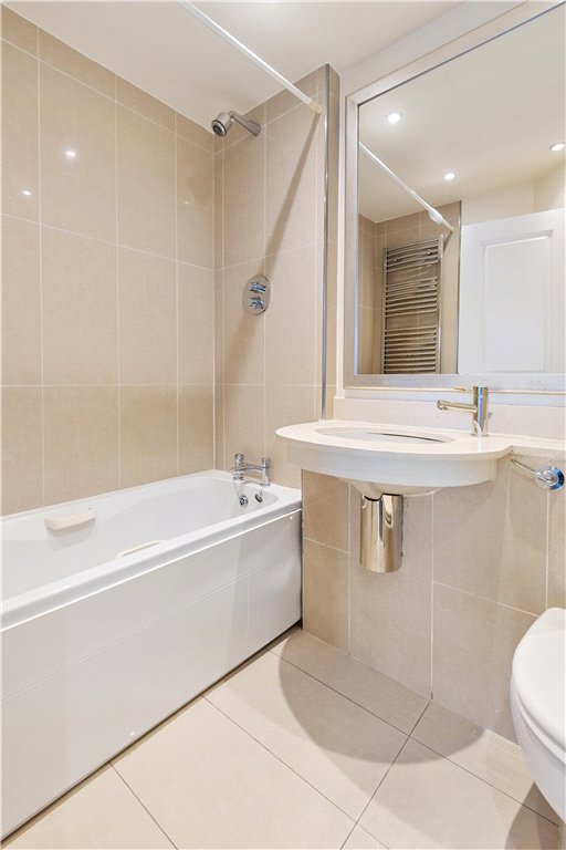- Bathroom with tiled floors, part-tiled walls, bath with overhead shower unit, heated towel rail, wash hand basin and WC.