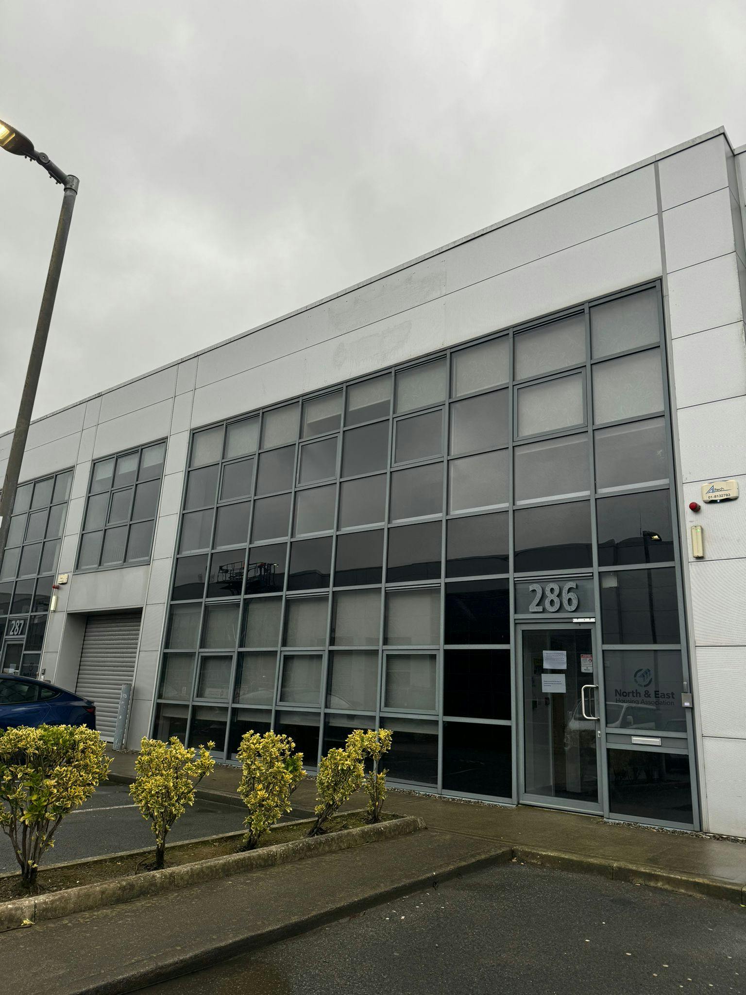 Constructed with a steel portal frame with insulated metal cladding, the unit feature a full-height aluminium framed glazed frontage across two floors, allowing ample natural light into the offices.