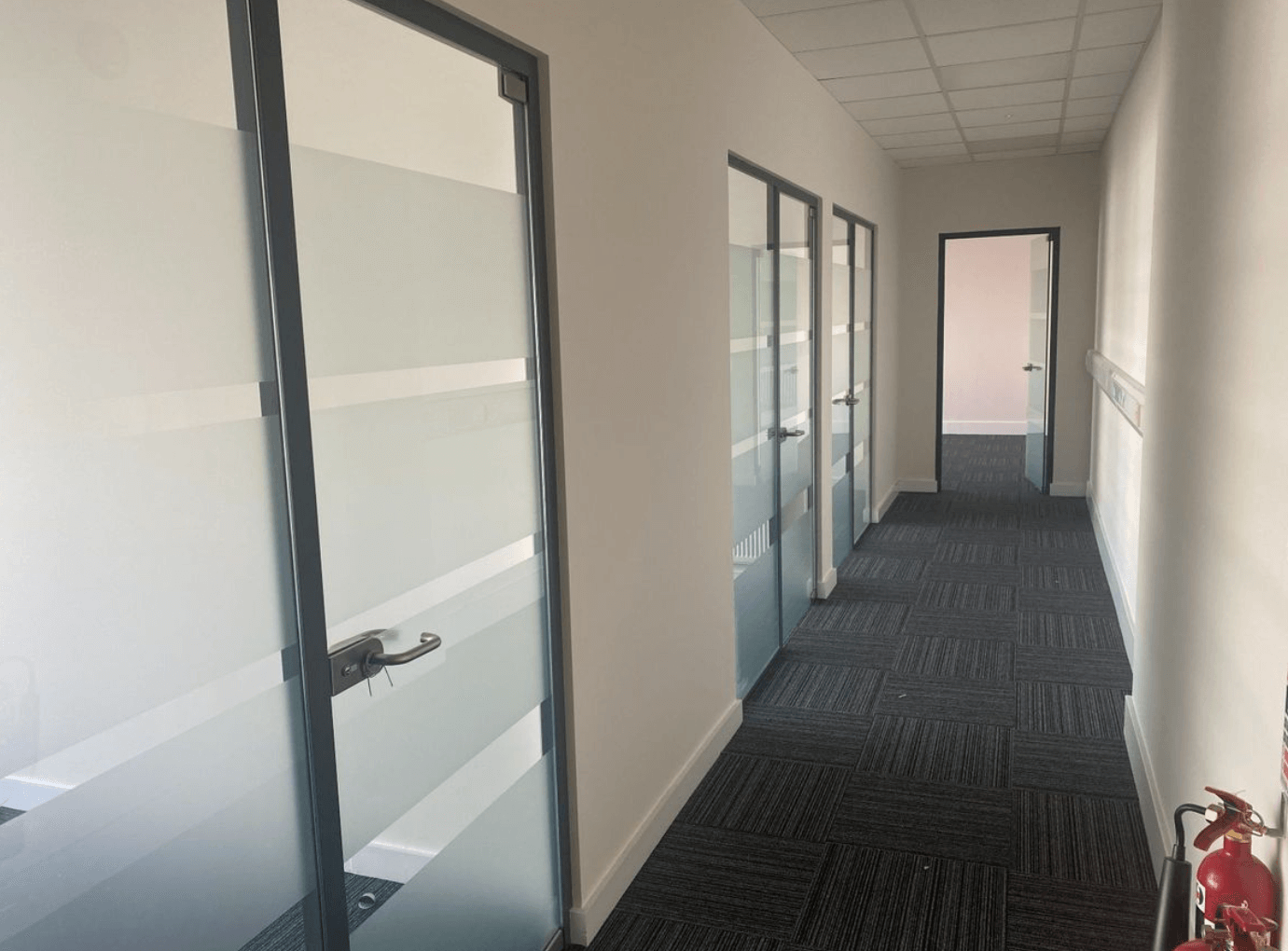 Constructed with a steel frame and finished in insulated metal cladding, the units feature a full-height aluminium framed glazed frontage across two floors, allowing abundant natural light into the offices.